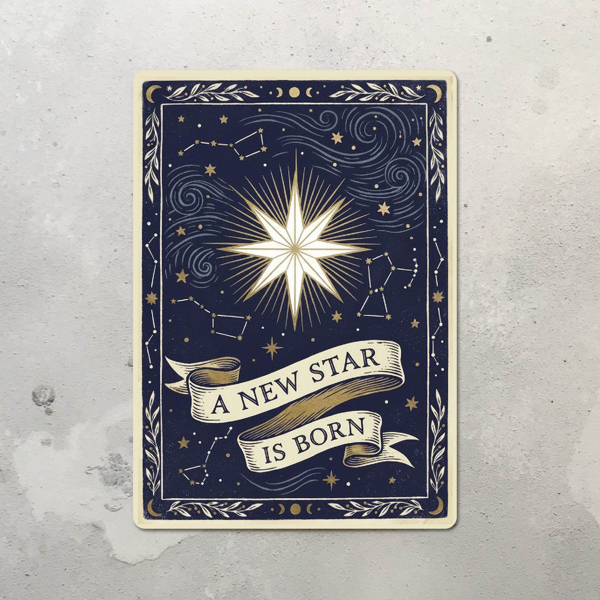 Welcome a little one to the galaxy with this enchanting, tarot-inspired new baby card. Featuring a celestial design with deep indigo tones and golden stars, this card is a mystical and modern way to celebrate a new arrival. The front features a vintage-style scroll reading “A New Star Is Born”, making it a beautiful keepsake for a new nursery.