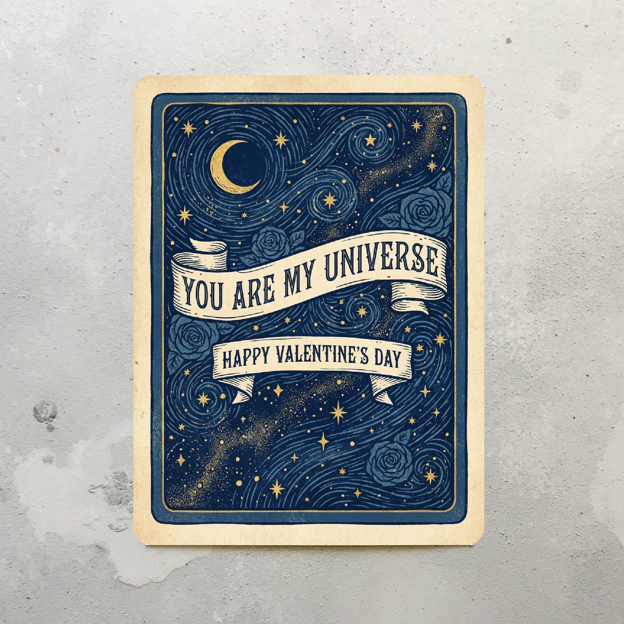 Featuring a “Starry Night” aesthetic, this card blends mystical celestial elements with classic romance. The deep indigo sky, golden crescent moon, and swirling constellations create a backdrop for the heartfelt message: “You Are My Universe.”