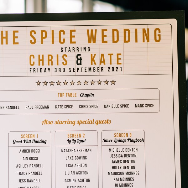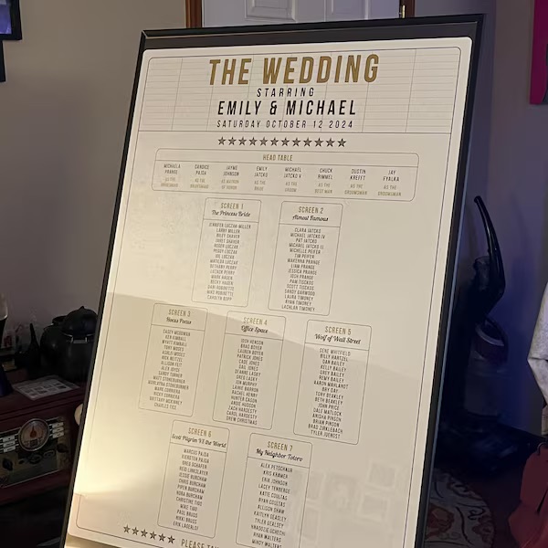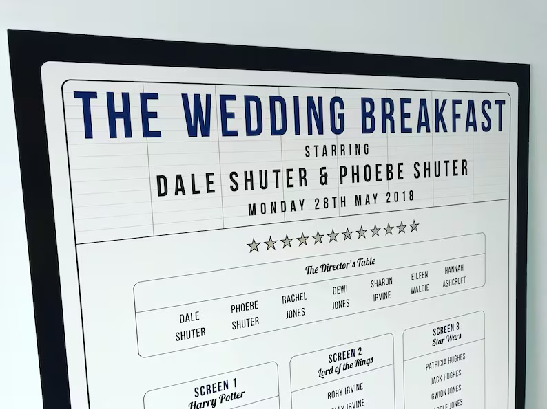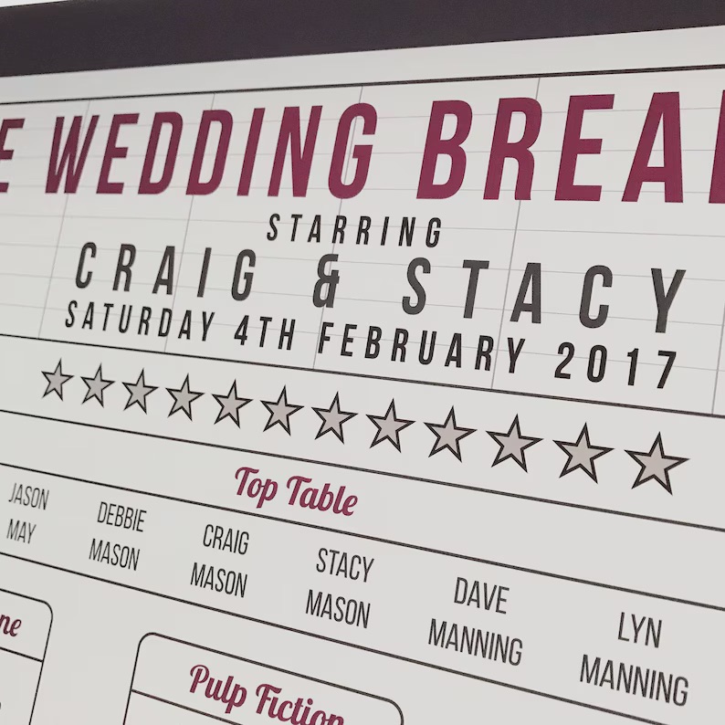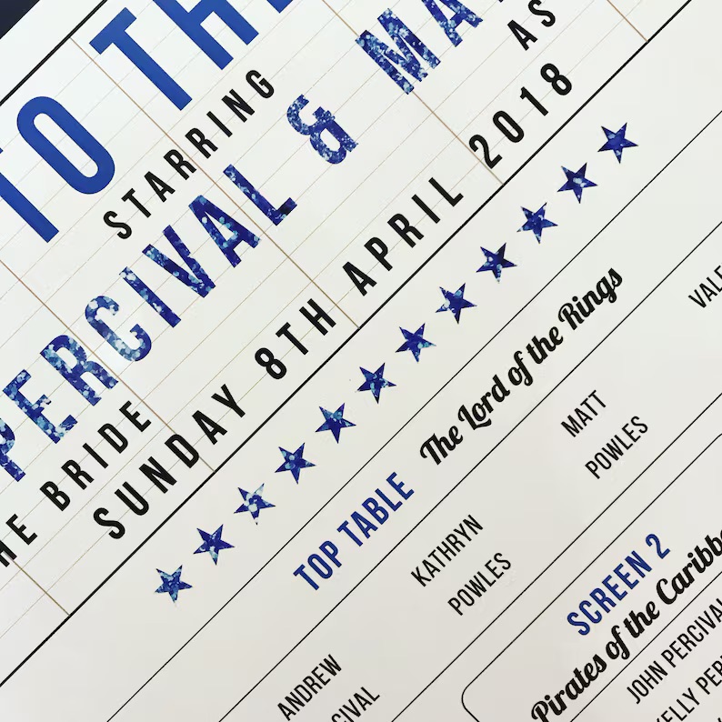Our wedding was on the 3rd August 2019 and we had a cinema theme running throughout. We were so happy when we found Joe as it meant all of our ideas and dreams could come true. We ordered not only the table plan but also our orders of service, table names, seat place names and our thank you cards. Joe has been unbelievable throughout the whole process and literally nothing was too much to ask. He clearly takes great pride in his work and has excellent customer service. We would recommend Joe to anyone who is planning a wedding or any event. We will certainly use him in the future.