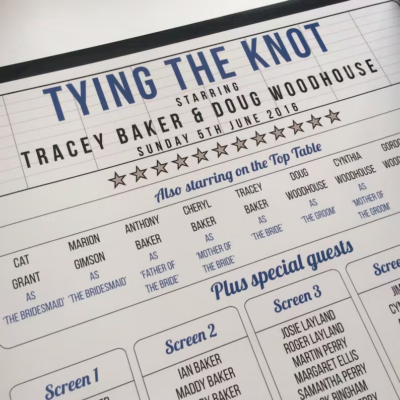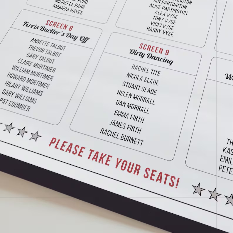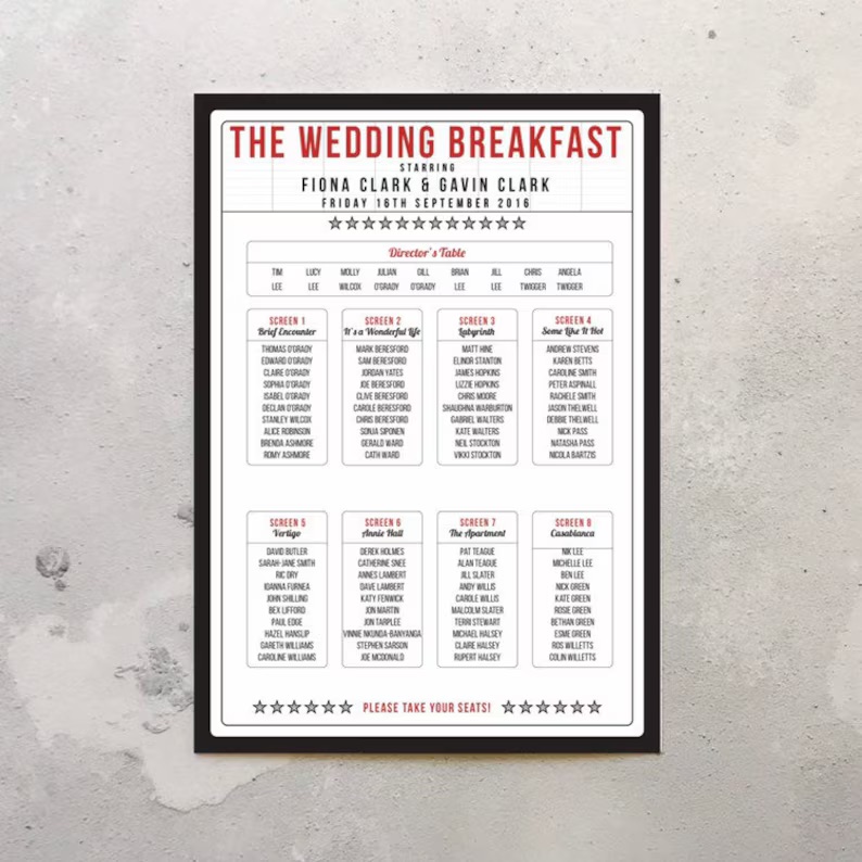 The table plan is printed onto high quality 190gsm glossy poster paper which gives it a real movie poster feel and is sent to you rolled ready for you to mount or frame. Matt finish also available upon request.